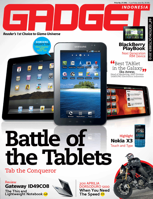 Teknologi mobile perlahan telah memasuki era komputer tablet. Mulai dari Apple iPad yang populer, DELL STREAK yang fenomenal, hingga SAMSUNG GALAXY TAB yang revolusioner. GADGET edisi terbaru melakukan head-to-head test diantara ketiga tablet tersebut untuk menemukan merk manakah yang patut menyandang gelar The Ultimate Tablet device? Jika Anda penasaran, buka saja halaman 36 dari majalah GADGET #64 dan temukan jawabannya!