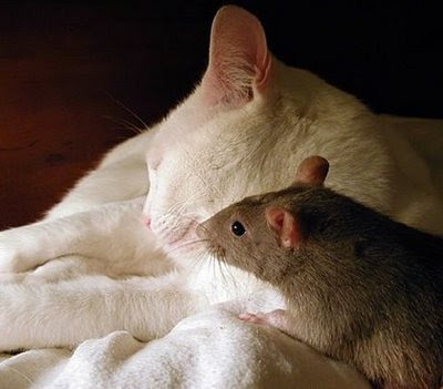 walah tikusnya makan bareng kucing kok gak dimakan yah tikusnya ama kucingnya?