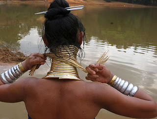 "Leher, bagian tubuh yang menghubungkan badan dengan kepala, akan disisipi gelang logam. Semakin tua semakin banyak (dan panjang). Leher direntang oleh gelang. Bahkan ada yang panjangnya sampe 40 cm [hampir setengah meter]."