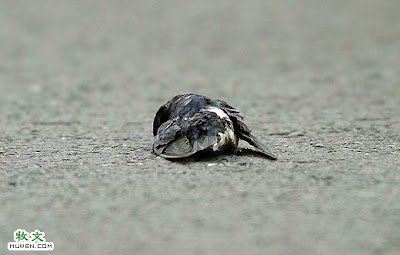 Dia telah menggunakan seluruh energinya, tetapi.... Sang fotografer mengatakan ia tidak dapat mengambil foto burung itu lagi karena ia kuwatir terhadap burung yang hidup itu akan terluka oleh mobil mobil yang melintas. Jadi ia mengambil mayat burung itu dan menaruhnya di pinggir jalan.