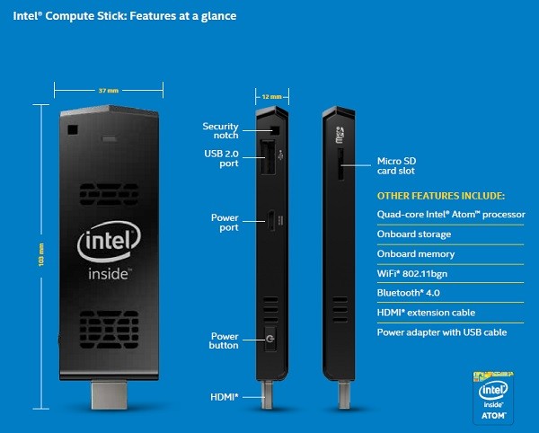 The top-level $149 Intel Compute Stick is full Windows 8.1 PC, with a 64-bit quad-core Atom Bay Trail CPU, 2GB RAM, and 32GB of flash storage. You plug the Compute Stick into a free HDMI port on a computer monitor, and you've got an entire PC.Apr 8, 2015
