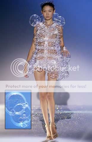 The most literal example of being encased in bubbles is Hussein Chalayan's famed dress of actual plastic bubbles.