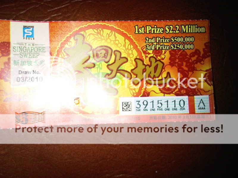 Ini ada lottery yang terbaru, Drawing tgl 3 Maret 2010, 1st prize Sing$2.200.000.- 2nd Prize Sing$500.000, 3rd Prize Sing$250.000