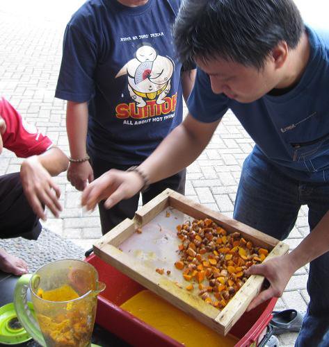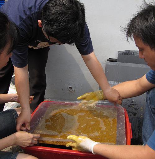 7.Sekarang saatnya mencetak. Saring campuran tersebut dengan screen. Caranya adalah dengan merendam screen ke dalam baskom lalu diangkat.