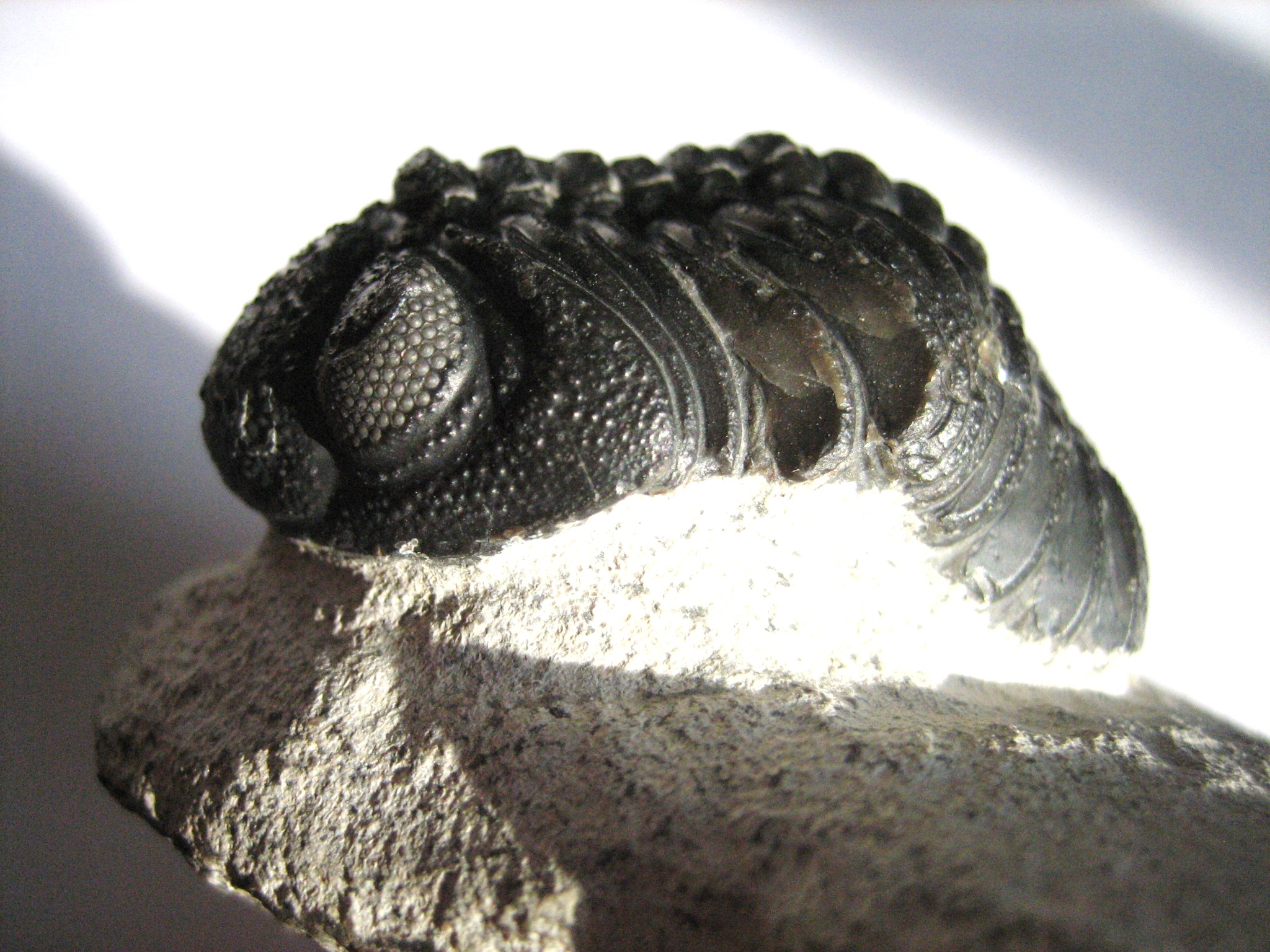 A Barrandeops sp. fossil from Anti-Atlas Mountains, Morocco with schizochroal eye visible.