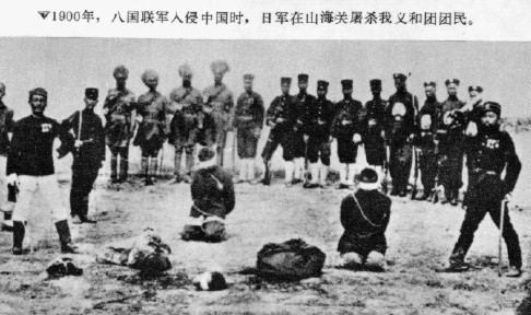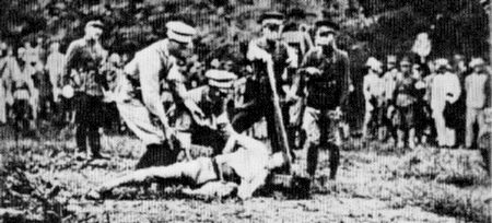 Seorang rakyat Cina akan dipenggal dengan katana, tampak seorang serdadu Jepang tersenyum.