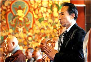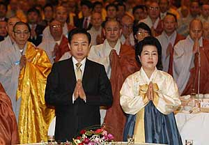 kini Lee Myung Bak terlihat lebih toleran, selain pernah beranjali di vihara korea selatan, juga pernah berdoa menggunakan hio pada saat undangan ke candi angkor watt bersama istrinya