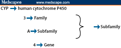 Drug biotransformation occurs by phase I reactions (oxidation, reduction, hydrolysis) and phase II reactions (conjugation). The resulting metabolite is highly polar and more easily eliminated. The cytochrome P-450 (CYP) system of enzymes is located in the endoplasmic reticulum of many cells, typically in the liver, and is primarily responsible for phase I oxidation.[19] The CYP system consists of superfamilies with over 100 types of enzymes, which are named by convention as follows using the example of CYP3A4: CYP (cytochrome P450), 3 (refers to family 3), A (refers to subfamily A), and 4 (designates gene number 4) (Figure 1). However, only a few enzymes (eg, CYP1A2, CYP2C9, CYP2C19, CYP2D6, CYP3A4) are responsible for the majority of drug biotransformation.[25,30] CYP3A4 is the enzyme responsible for the majority of drug biotransformation.[30] Not only are many drugs substrates of CYP 3A4, but drugs may also inhibit or induce this or other CYP enzymes.[25,29]