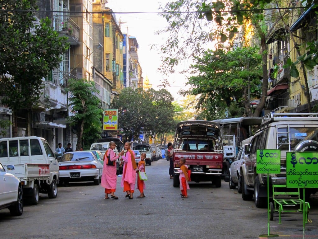 Bhikuni/samaneri dgn jubah merah mudah dan maron di Yangon, Myanmar.