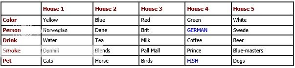 Let us assume that there are five houses of different colors next to each other on the same road. In each house lives a man of a different nationality. Every man has his favorite drink, his favorite brand of cigarettes, and keeps pets of a particular kind.