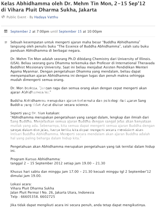 Kelas Abhidhamma oleh Dr. Mehm Tin Mon (Sept 2nd -15th)