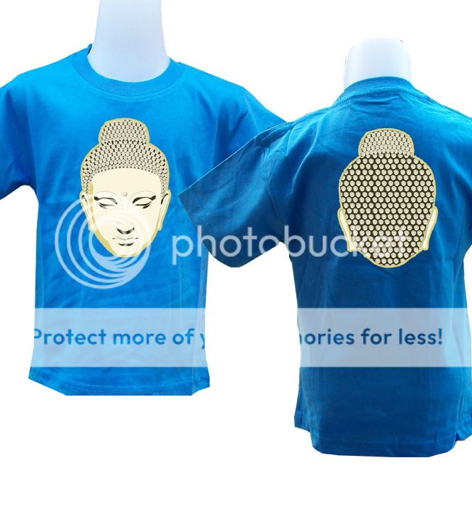 mau kira kira seperti ini latar belakang biru (pure blue atau deep blue) dengan gambar dengan pinggiran sapuan kuas berwarna emas seperti bubuk emas (garis nya seperti bintik bintik emas tetapi warna latar belakang biru terlihat sedikit di antara bintik bintik warna atau sapuan kuas warna emas [gold ink]). gambar  wajah Buddha tampak depan, punggung kaos tampak belakang kepala sang Buddha