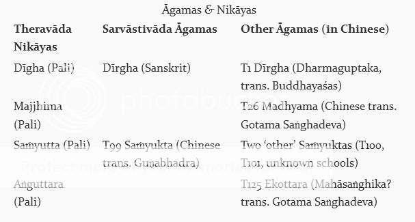 Dirgha Sarvastivada adalah penemuan yang sangat menarik: sebuah manuskrip sanskerta kuno, dua pertiga yang telah muncul secara misterius dari Afghanistan di beberapa tahun baru-baru ini. Ia belum diedit dan dipublikasikan. Ketika ini tersedia, akan terlihat bahwa kita akan hampir mempunyai koleksi lengkap sutra dari sekte Sarvastivada. Sebagai tambahan ada Dirgha dari sekte Dharmaguptaka. Sekte dari Ekottara tidak benar-benar diketahui, walaupun beberapa sarjana sementara menggolongkannya ke Mahasanghika. Semua ini adalah sekte awal Buddhisme yang berkembang di India kuno. Nikaya Pali ke-5, Khuddaka, adalah koleksi serba-serbi, mengandung campuran materi awal dan belakangan. Walaupun ada beberapa referensi di Kanon Mandarin dan Tibet ke Kśudraka Āgama, tidak ada koleksi yang ada secara utuh. Bagaimanapun, ada banyak padanan dari bagian-bagian Khuddaka yang ada, termasuk Dhammapada, Jataka, Atthakavagga, dan lainnya