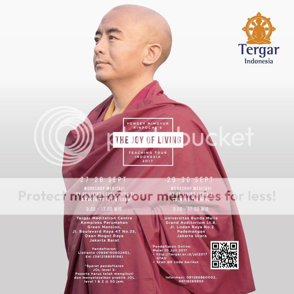 Dengan bahagia dan penuh rasa syukur, Tergar Indonesia kembali mengumumkan kedatangan Guru kami, Yongey Mingyur Rinpoche ke Indonesia, yaitu Bali, Surabaya, dan Jakarta. Mingyur Rinpoche kali ini akan berbagi pengalaman dan ajaran mengenai esensi Meditasi, Kebahagiaan, dan Kebijaksanaan, yang dikemas dalam bentuk Public Talk danWorkshop.