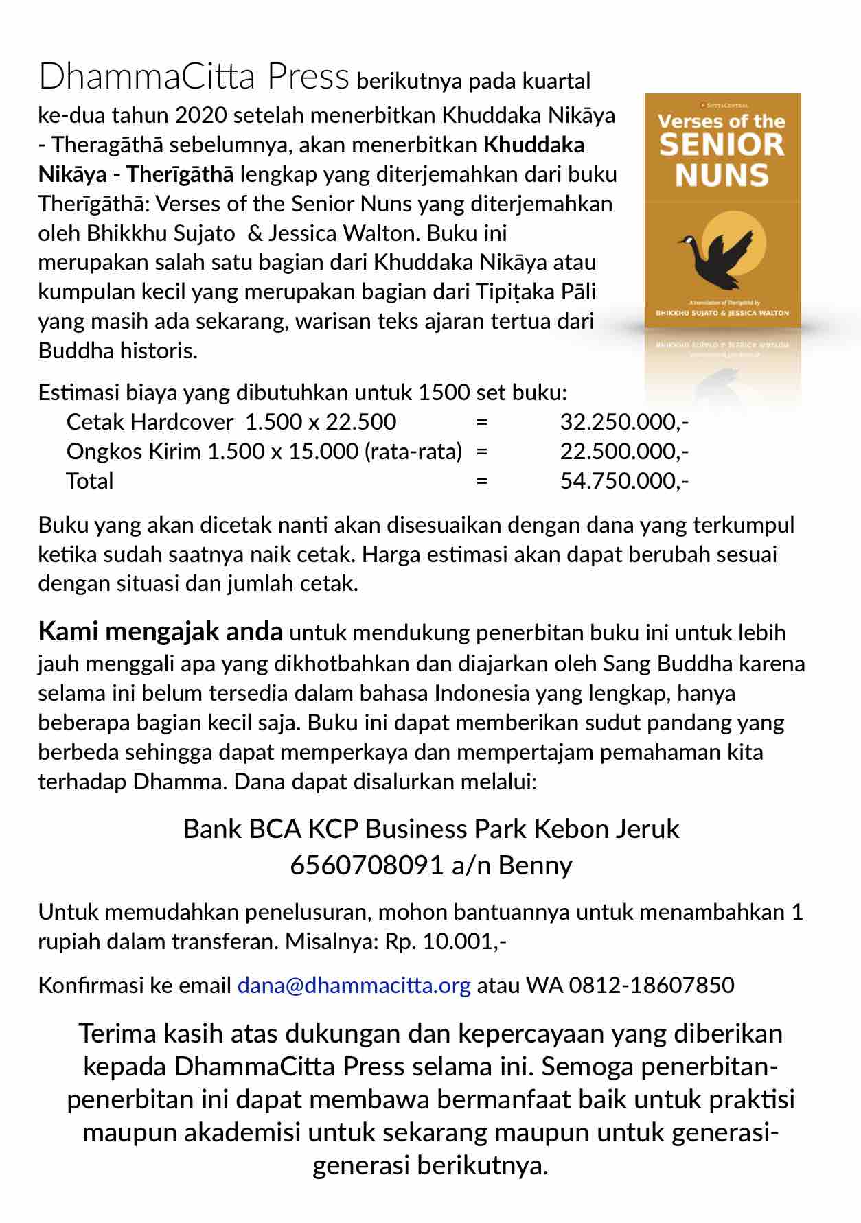 Kami mengajak anda untuk mendukung penerbitan buku ini untuk lebih jauh menggali apa yang dikhotbahkan dan diajarkan oleh Sang Buddha karena selama ini belum tersedia dalam bahasa Indonesia yang lengkap, hanya beberapa bagian kecil saja. Buku ini dapat memberikan sudut pandang yang berbeda sehingga dapat memperkaya dan mempertajam pemahaman kita terhadap Dhamma. Dana dapat disalurkan melalui: