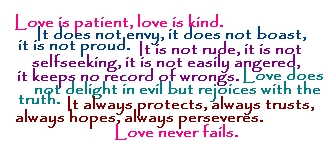 Love is kind and patient, never jealous, boastful, proud, or rude.